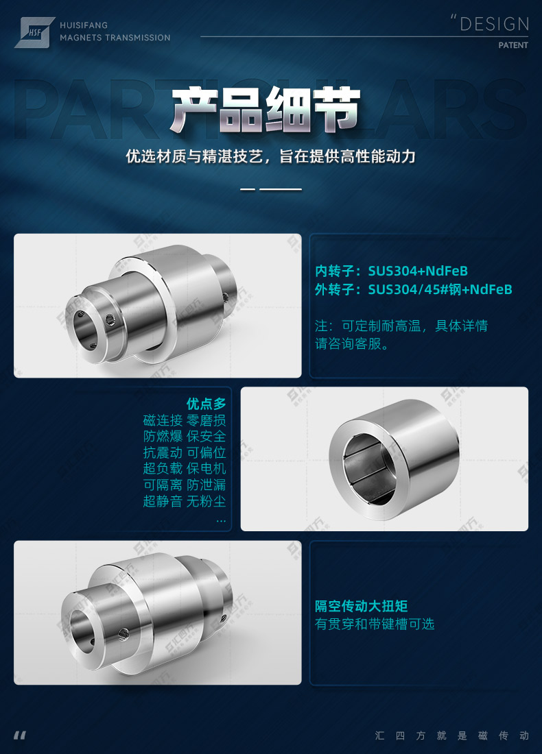 徑向磁力聯軸器(Radial Magnetic Coupling)內轉與外轉子的中間安裝靜態法蘭隔離罩,無接觸傳動。特別適用于中速、低速、高速輕型設備,適合正反轉傳動。防止泄漏,避免發生安全事故,減少維護和停工更換成本。在核電、 航天航空、 生物醫療、海洋裝備、石油化工、實驗室真空等設備都有著廣泛的應用。