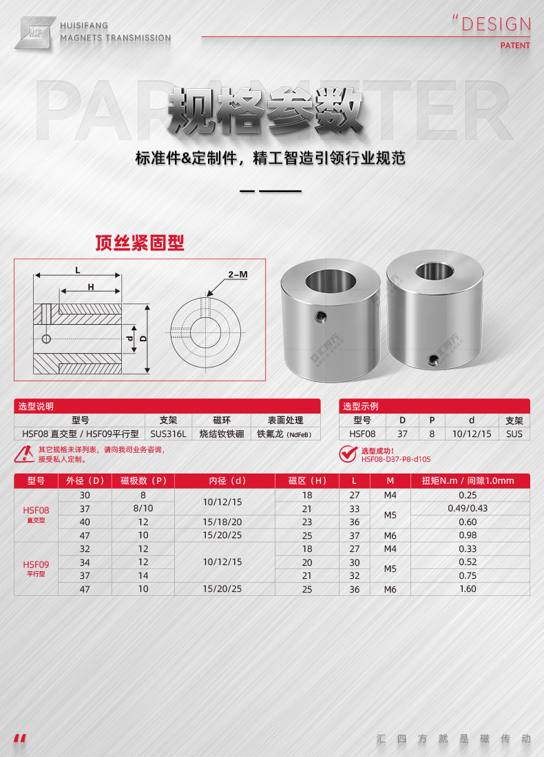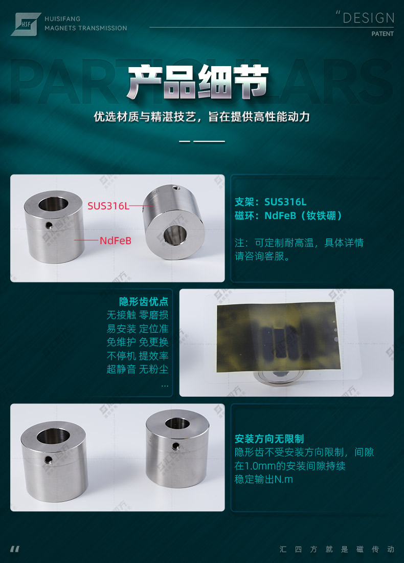 磁力輪(Magnet Gear)是利用釹鐵硼強鐵的吸力和斥力的相互作用原理,實現無接觸的動力傳遞裝置。SUS316L耐酸堿液體、氣體腐蝕。